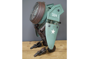 Constructed from durable metals, this model features blue wings and a cubby behind the clock face.