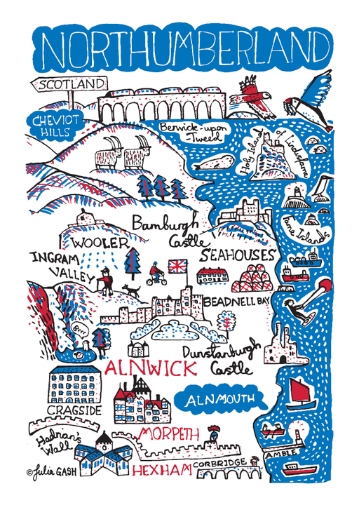 JUDGE SAMPSON LTDPart of the Northumberland range, this tea towel features an exclusive blue and white graphic of the county & its many attractions.