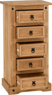 This narrow 5 drawer chest is a great height to use as a display for jewellery and cosmetics. Featuring 5 strong pine drawers, the unit has ample storage for small folded items.