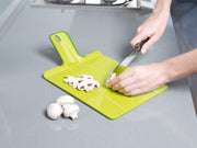 The original folding chopping board from Joseph Joseph. When the handle is squeezed, the sides fold up, allowing food to easily slide into a pan, without heading in every possible direction.