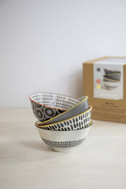 This packaged gift set includes 4 contemporary bowls from the 'Monochrome' range. These feature monochromatic colours on the exterior, with some vibrant primary colours and patterns on the inside. While each bowl in the set is unique, the designs pair well together, giving the set the feel of a mix and match chosen by an interior designer.